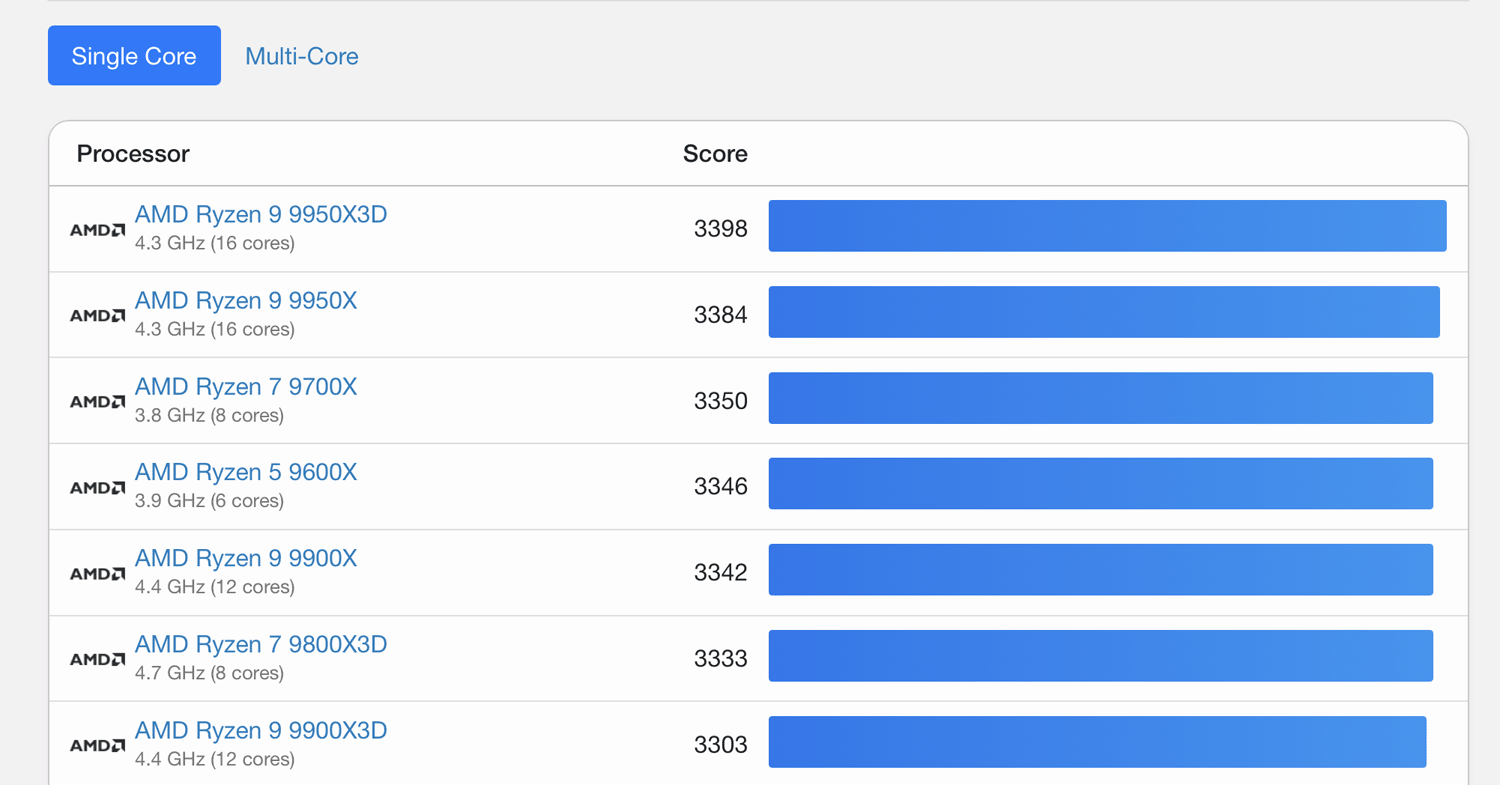 Als diese Zeilen geschrieben wurden, führte in der (nicht mehr ganz taufrischen) Rangliste von Geekbench noch der AMD Ryzen 9 9950X3D mit einem Single-Core-Wert von 3398 Punkten.