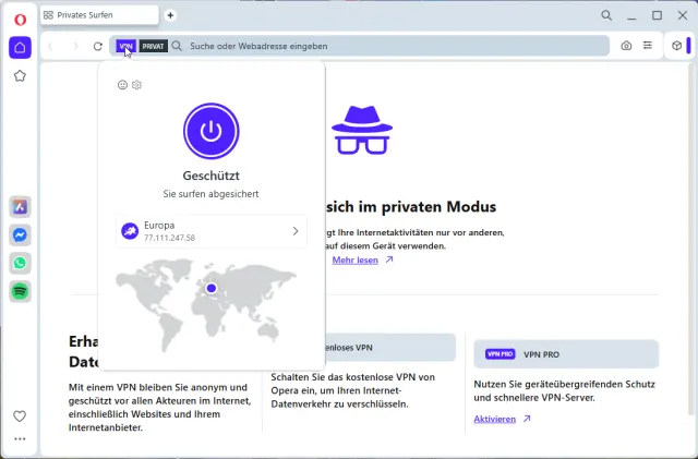 Bild 2: Schnelles Gratis-VPN bietet auch der Opera-Webbrowser – aber nur innerhalb des Surfprogramms und für maximal 300 MB