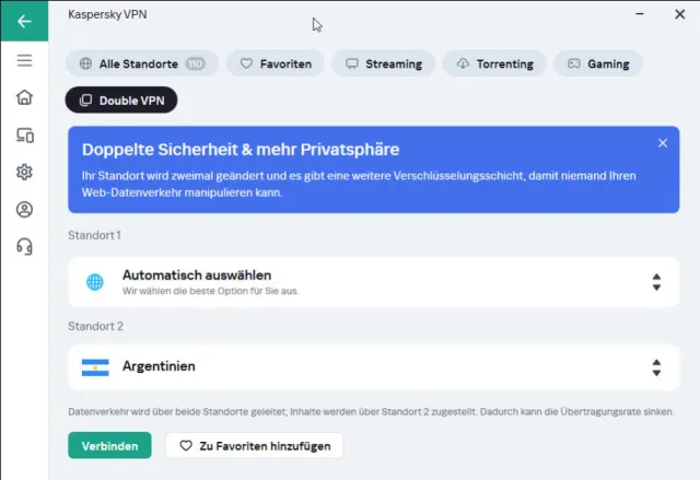Tipp: Für extreme Sicherheit bieten einige Anbieter auch «doppeltes VPN». Damit geht die Leitung durch zwei VPN-Server in verschiedenen Ländern. Diese Funktion bietet etwa Kaspersky im Plus-Paket an, Bild 5.