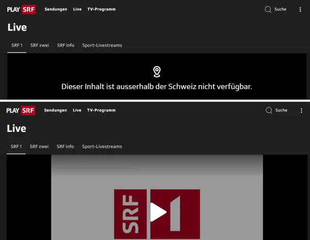 Bild 8: Geoblocking umgehen und im Urlaub SRF 1 sehen – oben ohne VPN, unten mit