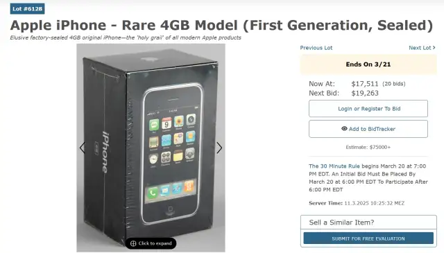 Wer aktuelle iPhones für teuer hält, ist noch nicht auf die Suche nach einem Modell der ersten Generation gegangen. Der US-Auktionator RR Auction schätzt den Wert eines solchen Gerätes im Neuzustand mit ungeöffneter Originalverpackung in der seltenen Speicherversion mit 4 GB, die nur zwei Monate verkauft wurde, auf bis zu 75'000 US-Dollar.