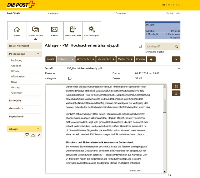 Schliesslich arbeitet E-Post Office mit dem hauseigenen Dienst Swiss Post Box zusammen. Mit diesem Service kann man sich die Briefpost öffnen und einscannen lassen sowie die digitalierten Briefe im E-Post Office aufbewahren lassen.