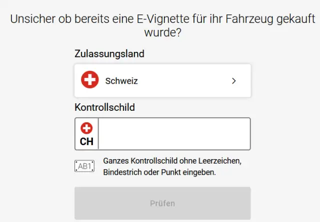 Es gibt im Via-Portal die Möglichkeit zu überprüfen, ob bereits eine gültige E-Vignette für ein spezifisches Kontrollschild erworben wurde. Dies ist zum Beispiel bei einem Leihfahrzeug oder bei Carsharing nützlich.