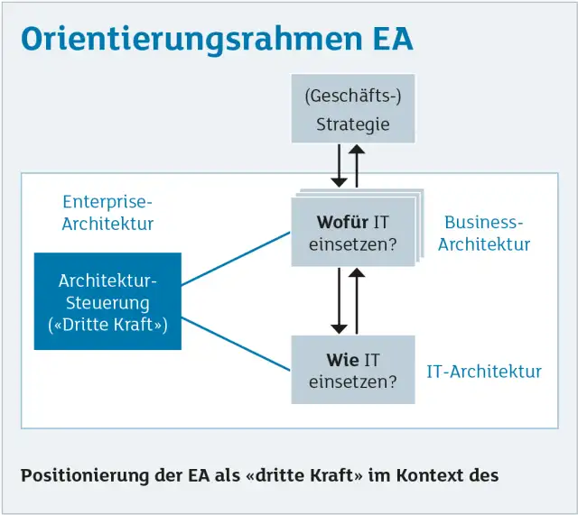 - Als «dritte Kraft» ergänzt die EA einen Rahmen um das «Wofür» und «Wie» und fördert so das langfristige, übergreifende Alignment. Neben der Definition und Ausrichtung auf ein gemeinsames Zielbild stellt diese Mechanik auch sicher, dass es weder Anarchie seitens Fach noch Diktatur seitens IT gibt.