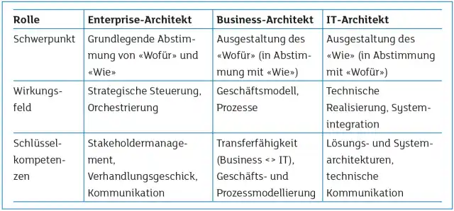 Häufig wird die EA-Rolle als Erweiterung einer bestehenden IT-Rolle umgesetzt. Dies wird jedoch den Aufgaben nicht gerecht und verletzt den Grundsatz von EA als «dritter Kraft». Aus den spezifischen Aufgaben ergeben sich die in der Tabelle aufgeführten spezifischen Ausgestaltungen.