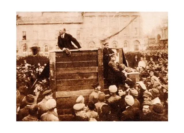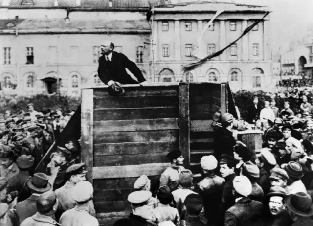 Lenin auf einer anderen Version des Bildes. Trotzki und Kamanew wurden entfernt.