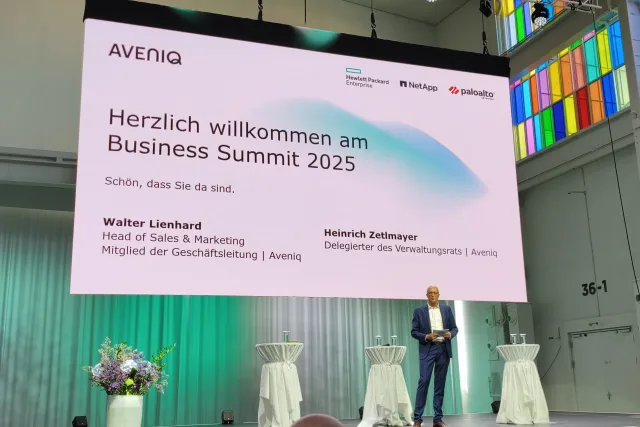 Mit ihren bunten Fensterscheiben strahlt die Trafo-Halle in Baden etwas Sakrales aus. Entsprechend andächtig lauschten die zahlreichen Gäste beim Aveniq Business Summit 2025 den einleitenden Worten von Walter Lienhard, Head of Sales & Marketing, und den Ausführungen des VR-Delegierten Heinrich Zetlmayer. Einen CEO in Person von Tom Kleiber wird man erst beim nächsten Summit erleben; er übernimmt sein Amt per 1. Januar 2026.