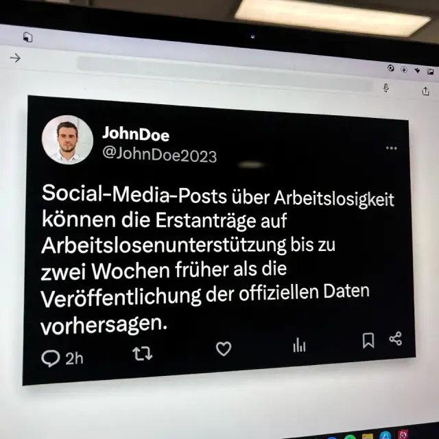 Auch demografische Justierungen sind eingesetzt worden, um der nicht repräsentativen Nutzerbasis von X Rechnung zu tragen. Zusätzlich sind die Ansprüche aus der Arbeitslosenversicherung in den USA auf nationaler, bundesstaatlicher und Stadtebene berücksichtigt worden. Das Modell hat fast drei Mal mehr Aufdeckungen einer Arbeitslosigkeit erfasst als frühere regelbasierte Ansätze. Gleichzeitig wurde eine hohe Genauigkeit beibehalten.
