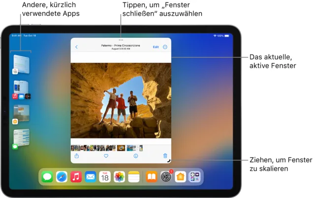 Kurz zusammengefasst bietet Stage Manager neue Möglichkeiten für Multitasking, mehr Übersicht auf dem Bildschirm und effizientere Workflows:Die Fenster wandern beim Minimieren (Minus-Zeichen bei Mac-Fenstern; drei Punkte oben bei iPad-Fenstern) nicht mehr ins Dock, sondern werden verkleinert an der linken Bildschirmseite dargestellt. Klickt oder tippt man eines davon wieder an, rückt es erneut in den Fokus, während im Gegenzug die bereits geöffneten Fenster an den linken Rand minimiert werden.