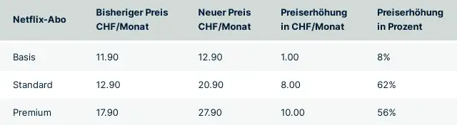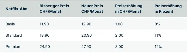 Bei der letzten Preiserhöhung im November 2021 blieben die Basic-Kunden von Netflix verschont, doch nun müssen sie neu einen Franken mehr zahlen. Konkret kostet ihr Abo jetzt 12.90 Franken. Die Standard- und Premium-Kunden müssen eine erneute Preissteigerung verkraften. Und zwar für Standard um zwei Franken auf 20.90 Franken und für Premium sogar um drei Franken auf 27.90 Franken.