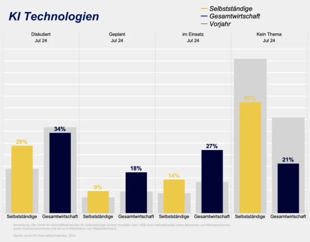 In der Gesamtwirtschaft setzen inzwischen 27 Prozent der befragten Unternehmen KI ein und der Anstieg zum Vorjahr ist mit plus 14 Prozentpunkten deutlicher als bei den Selbstständigen. Knapp die Hälfte der Selbstständigen (47 Prozent) sieht die Technologie weiterhin nicht als Thema, im Vorjahr waren es hier noch 66 Prozent. Die restlichen 38 Prozent der Selbstständigen diskutieren den Einsatz oder planen ihn konkret. In der Gesamtwirtschaft ist für 21 Prozent KI gegenwärtig kein Thema, während 52 Prozent den Einsatz diskutieren oder planen.