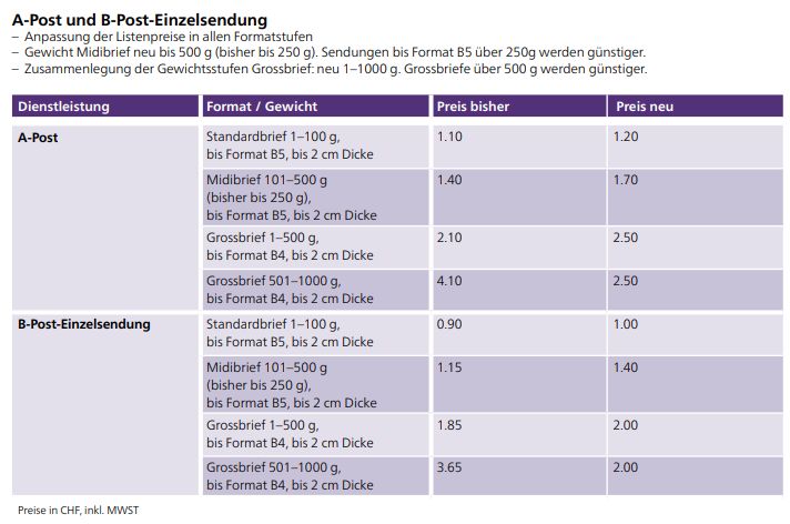 A-Post- und B-Post-Briefe werden je 10 Rappen teurer, Priority- und Economy-Pakete kosten künftig Fr. 1.50 mehr. Die Preiserhöhungen sind laut der Post zum einen aufgrund der anhaltenden Rückgänge der Briefmengen und der Geschäfte am Postschalter notwendig. Zum anderen verursache die aktuelle Teuerung der Post erhebliche Mehrkosten bei Energie, Transport, Material und Löhnen.