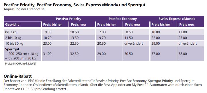 Die Post hat sich gemeinsam mit dem Preisüberwacher auf eine Erhöhung der Brief- und Paketpreise geeinigt: Ab dem 1. Januar 2024 kostet ein A-Post-Brief im Standardformat Fr. 1.20 (bisher Fr. 1.10), ein B-Post-Brief kostet Fr. 1.– (bisher 90 Rappen). Ein Economy-Paket bis 2 Kilogramm kostet neu Fr. 8.50 (bisher Fr. 7.–), ein Priority-Paket Fr. 10.50 (bisher Fr. 9.–). Die Einigung zwischen der Post und dem Preisüberwacher beinhaltet weitere Preismassnahmen und auch Angebotserweiterungen.