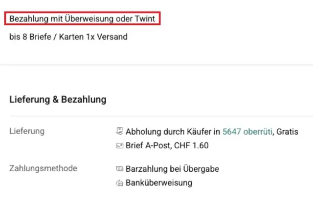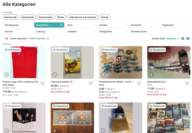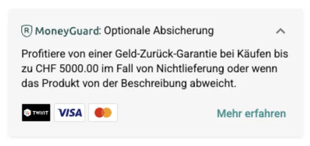 Will ein Verkäufer Bezahlungen per Kreditkarte oder Twint empfangen und die Ware danach versenden, ist MoneyGuard Pflicht. Verkäufe mit Abholung oder Barzahlung sind allerdings weiterhin ohne den MoneyGuard-Schutz möglich. Der Dienst würde hier auch keinen Sinn ergeben.