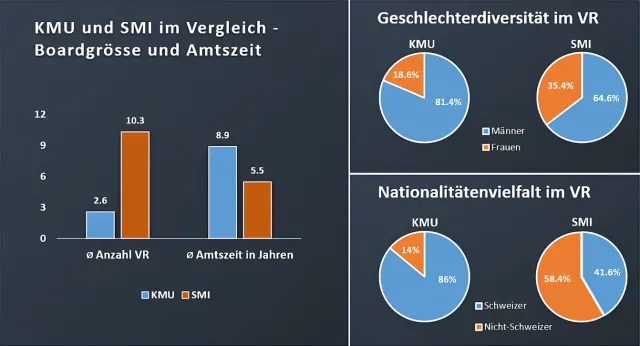 Verwaltungsräte von Schweizer KMU seien deutlich homogener und kleiner als die von börsenkotierten Unternehmen, hiess es in der Mitteilung. So haben die Konzerne im Swiss Market Index (SMI) im Verwaltungsrat aktuell eine Frauenquote von durchschnittlich 35 Prozent. Allerdings verlangt der Bundesrat von grossen Unternehmen künftig auch einen Mindest-Frauenanteil im Verwaltungsrat und der Geschäftsleitung.