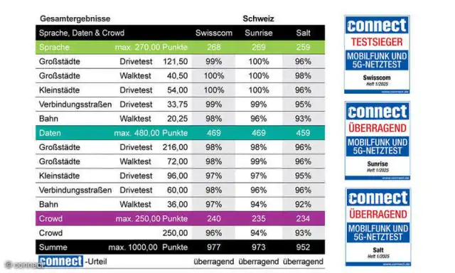 In der Sprachwertung sicherte sich Sunrise mit 2 Punkten mehr als im Vorjahr knapp den Spitzenplatz vor Swisscom, die ihre Punktzahl halten konnte. Salt folgt auch hier dicht dahinter. Der Ausbau von VoLTE (Voice over LTE) sorge in allen Netzen für kurze Rufaufbauzeiten und hohe Sprachqualität.