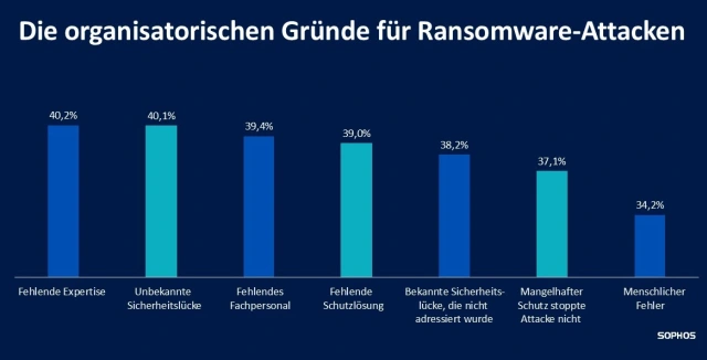 63 Prozent der befragten Unternehmen weltweit bestätigen, dass Ressourcenprobleme ein Faktor dafür waren, dass sie Opfer des Angriffs wurden. Die Unternehmen in Deutschland (67 Prozent) und in der Schweiz (72 Prozent) liegen hier über dem internationalen Schnitt. Global wurden in diesem Zusammenhang mangelnde Fachkenntnisse als wichtigste operative Ursache in Unternehmen mit mehr als 3.000 Mitarbeitern genannt. Unternehmen mit 251 bis 500 Mitarbeitern kämpften am häufigsten mit einem Mangel an personellen Ressourcen bzw. Kapazitäten.