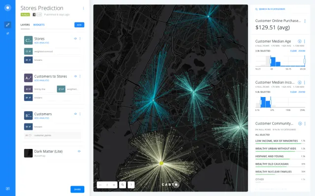 Anders als ältere Lösungen für grafische Informationssysteme soll das Selfservice-Portal eine unkomplizierte Verwendung und Pflege der eigenen Daten ermöglichen, während ein integrierter Wizard komplexe Standort-Apps zu implementieren hilft, ohne dass man selbst eine Zeile Code schreiben müsste. Dieser «CARTO Builder» erleichtert mit seinen Drag-and-Drop-Funktionen Anwendern ohne Programmierkenntnisse die Analyse von Standortdaten. Widget-basierte Dashboards liefern relevante Erkenntnisse und versuchen sich sogar an Vorhersagen. Eine «Auto Styling»-Funktion, die zugeordnete Daten analysiert, soll Beziehungen und Trends erkennen, um so Rätselraten zu vermeiden. In der Builder-Umgebung lassen sich auch erweiterte standortbasierte Apps erstellen und Ergebnisse direkt aus Dashboards extrahieren, ohne dass Visualisierungen oder Originaldaten dafür bearbeitet werden müssten. Daten aus Tabellenkalkulationen, Sensornetzwerken und anderer Unternehmens-Software sind einfach zu verknüpfen.