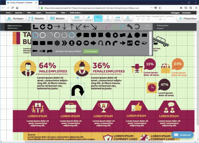 Dabei hilft eine Vielzahl von fertigen Vorlagen, die in weitem Rahmen abgeändert, ergänzt und umgestaltet werden können. So entstehen etwa Zeitachsen, kommentierte Landkarten, Flussdiagramme, Schrittanweisungen und Ähnliches mit geringem Aufwand und ohne grosse Vorarbeit.