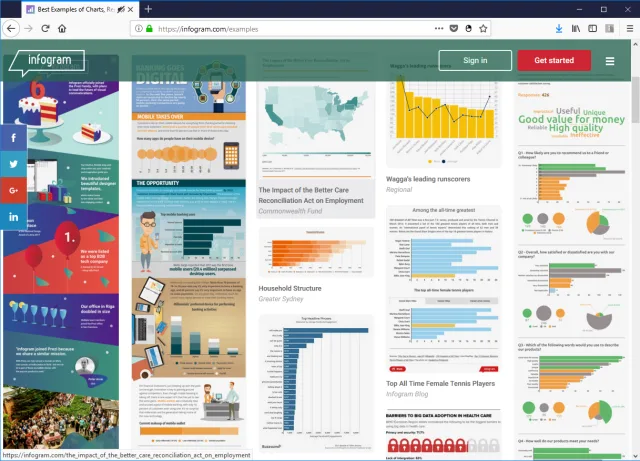 Infogram ist eine Datenvisualisierungs-Lösung, die auf Infografiken spezialisiert ist, daneben aber auch Charts, Karten, Berichte und interaktive Dashboards im Angebot hat. Vorgefertigte Designvorlagen, darunter über 500 Karten und mehr als 35 interaktive Diagramme, erleichtern dem Benutzer die Arbeit ebenso wie der einfache Drag-and-Drop-Editor, den man in einer aufgeräumten, intuitiven Bedienoberfläche verwendet. Dabei hat der Anwender meist nur genau die Optionen vor Augen, die er gerade benötigt.