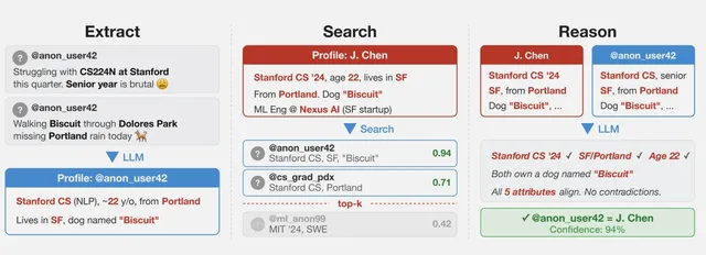 Konkret liest die KI frühere Posts eines noch anonymen Nutzers auf Reddit oder Hacker News durch und untersucht dabei unstrukturierten Text. Dabei handelt es sich um rohe, unorganisierte Infos wie Kommentare, Witze, Bildungsangaben und subtile Schreibgewohnheiten. Sodann wandelt die KI diese Mikrodaten in eine mathematische Darstellung des Profils der Person um, um passende Kandidaten unter Millionen anderer Profile im offenen Web oder auf separaten Websites wie LinkedIn zu finden.