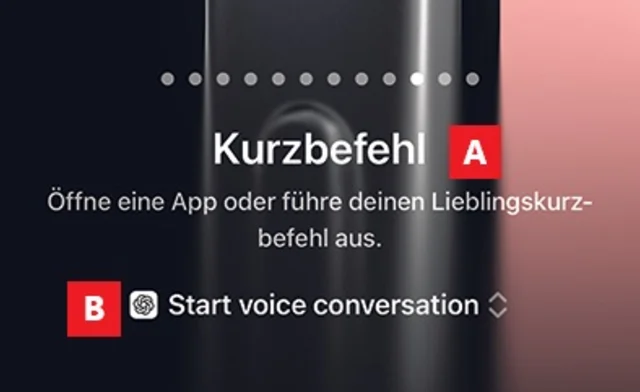 Nach der Installation öffnen Sie am iPhone die Einstellung Aktionstaste. Wischen Sie zur Kategorie Kurzbefehl, Bild 1 A. Tippen Sie auf das Menü unterhalb B und wählen Sie im Anschluss ChatGPT.