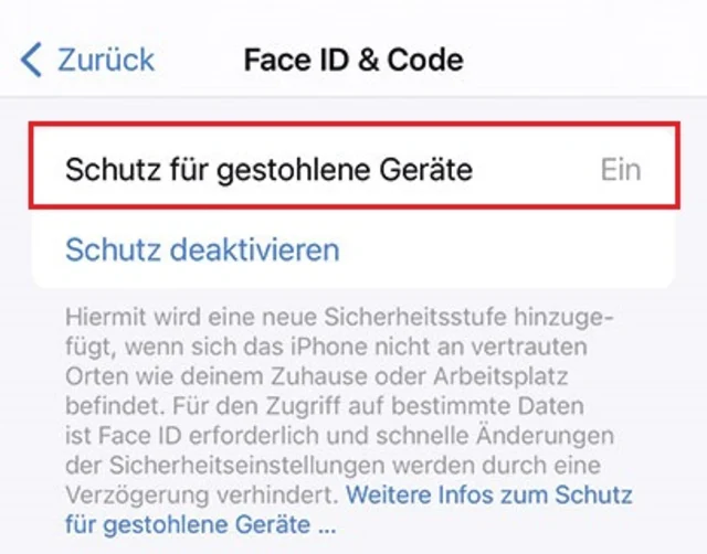 Öffnen Sie in den Einstellungen des Geräts den Bereich Face ID & Code, Bild 1. Wenn Ihr Gerät mit Touch ID ausgestattet ist, finden Sie die Aktivierung sinngemäss in der Einstellung Touch ID & Code. Wischen Sie nach unten zur Option Schutz für gestohlene Geräte und tippen Sie auf die Schaltfläche Schutz aktivieren. Jetzt ist der erweiterte Diebstahlschutz aktiviert, bis Sie ihn wieder abschalten, Bild 2.