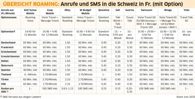 Der PCtipp hat die Roamingkonditionen der zehn Anbieter Aldi Suisse Mobile, Coop Mobile, iWay, M-Budget Mobile, Quickline, Salt, Sunrise, Swisscom, Wingo und Yallo miteinander verglichen. Nachfolgend lesen Sie die Einzelanalysen. Zum besseren Vergleich beachten Sie bitte auch die einzelnen Tabellen im Beitrag.Aldi Suisse Mobile