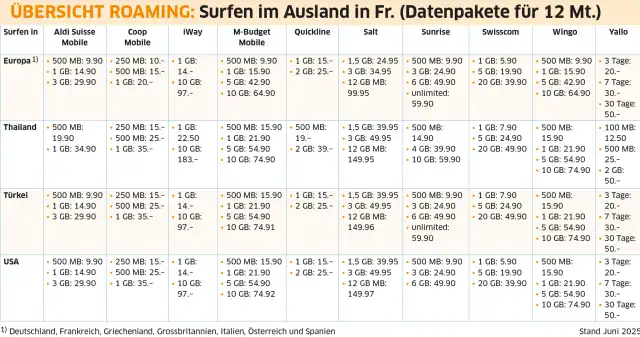 Möchten Sie von Thailand aus im Internet surfen, wird es kostspielig: So kostet ein Datenvolumen von 1 GB stolze Fr. 34.90. Aldi Suisse Mobile bietet nun auch eSIM-Unterstützung für ausgewählte Abos und Roamingpakete an, was die Aktivierung im Ausland vereinfacht.