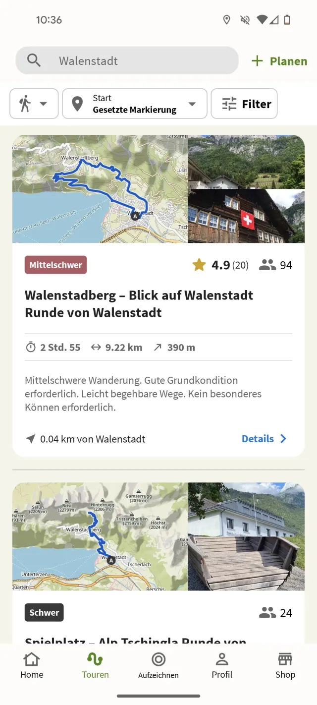 Bei der Routenplanung gibt es ein Entdecken-Funktion, bei der Sie in vorgegebenen Wanderungen stöbern können, Bild 2. Wenn Sie lieber selbst planen, finden Sie natürlich auch ein umfassendes Routenplaner-Tool. Anschliessend können Sie das Kartenmaterial offline abspeichern, damit Sie ohne Handy-Netz Zugriff haben. «Komoot – Wandern und Radfahren» bietet dabei sogar eine Sprachnavigation an.