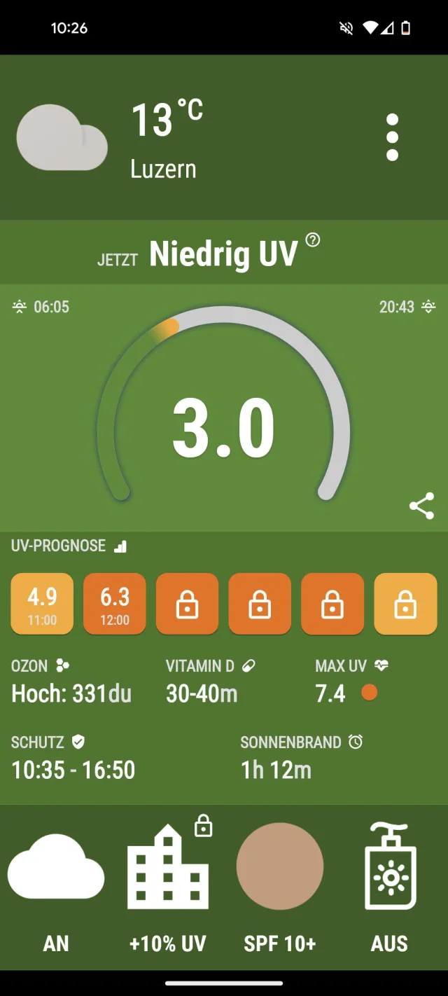 Damit man nicht vergisst, rechtzeitige Schutzmassnahmen zu treffen, gibt es die App «UVI Mate – UV Index Now». Die Vorkehrungen beginnen schon vor der geplanten Wanderung. Die App zeigt an, wie hoch die UV-Belastung in einer Region ist und wann die optimale Zeit ist, um sich dort aufzuhalten, Bild 9. In der App können Sie ausserdem Ihren Hauttyp hinterlegen und wissen so genau, wie lange Ihr natürlicher Schutz anhält.