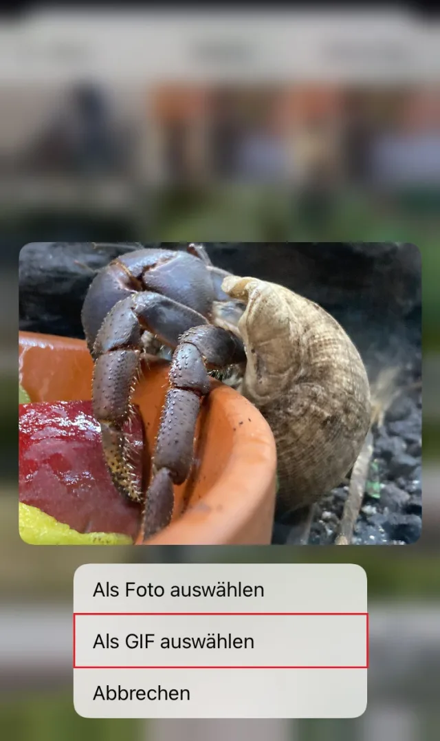 Wenn Sie den Messenger WhatsApp nutzen, können Sie aus einer Live-Aufnahme zudem ein bewegtes GIF-Filmchen erzeugen. Öffnen Sie dazu einen Chat in dem Messenger, tippen Sie unten links auf das Pluszeichen und anschliessend auf Fotos. Nun tippen Sie mit einem Finger länger auf die gewünschte Live-Aufnahme, um ein kleines Kontextmenü zu öffnen, in dem Sie Als GIF auswählen antippen, Bild 12. Anschliessend können Sie die Aufnahme noch zuschneiden, drehen oder Text hinzufügen und schliesslich als animiertes GIF verschicken.