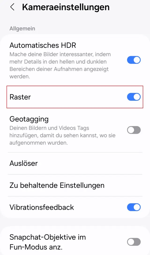 Sowohl Android-Handys als auch iPhones blenden ein solches Raster auf Wunsch ein. Unter Android öffnen Sie die Kamera-App und tippen oben links auf das Zahnrad-Symbol. Damit öffnen Sie die Kameraeinstellungen. Scrollen Sie bis zu Raster und aktivieren Sie den Schalter dahinter, um die Gitternetzlinien einzublenden, Bild 2.