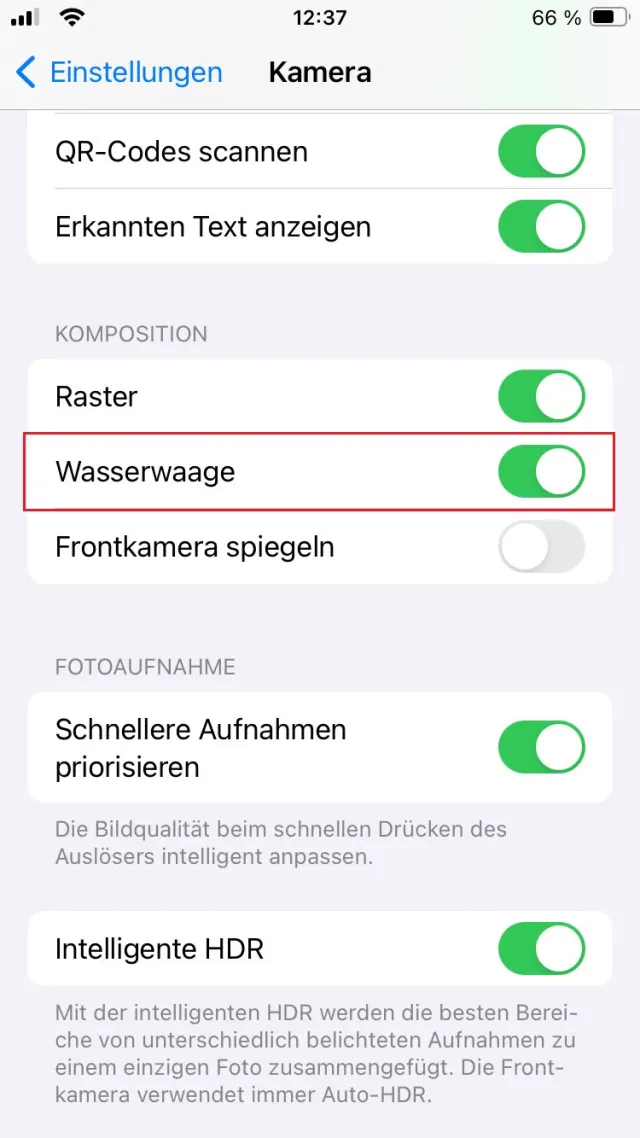 iOS bietet zusätzlich noch eine Wasserwaagen-Funktion, die Sie unabhängig oder auch zusätzlich zu den Gitternetzlinien in den Einstellungen des Telefons unter Kamera aktivieren, Bild 3. Android fehlt eine vergleichbare Funktion.