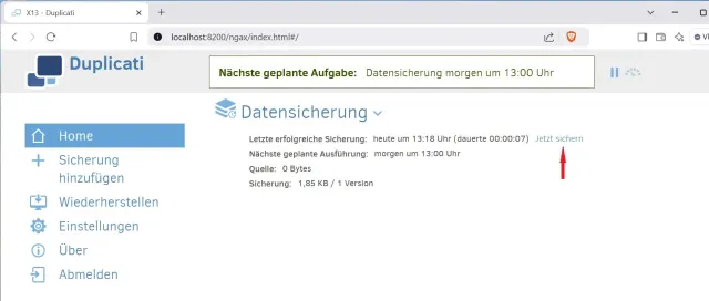 Zuletzt klicken Sie auf Speichern, um den neuen Backup-Auftrag zu sichern. Um ihn das erste Mal auszuführen, greifen Sie in der Übersicht zur Option Jetzt sichern, Bild 10. Ansonsten führt Duplicati ihn zum nächsten vorgesehenen Zeitpunkt aus.