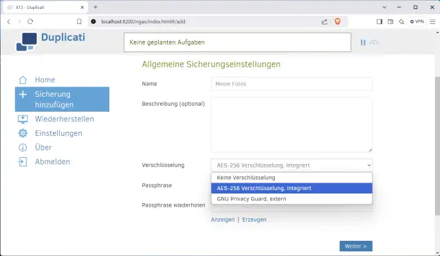 Klicken Sie jetzt auf Sicherung hinzufügen, belassen Sie die Auswahl danach auf Neue Sicherung konfigurieren und bestätigen Sie mit Weiter. Vergeben Sie einen Namen wie Datensicherung oder Dokumente- & Foto-Backup. Das Feld Beschreibung lassen Sie leer. Wichtiger ist die Frage der Verschlüsselung. Standardmässig ist AES-256 Verschlüsselung, integriert ausgewählt, Bild 8. Duplicati kopiert damit Ihre Daten nicht nur einfach, sondern verschlüsselt sie zugleich per Passwort. Wenn Sie Ihre Dateien nur auf eine externe Festplatte kopieren, die Sie zum Beispiel in den privaten Safe legen oder anderweitig sicher verwahren können, deaktivieren Sie die Verschlüsselung. Ansonsten empfehlen wir, sie eingeschaltet zu lassen und das Kennwort in einem Passwortmanager wie Keepass (Download: keepass.info/download.html) abzulegen.