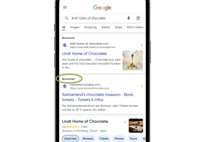 Wer bei Google nach Begriffen rund um das Thema „Lindt Home of Chocolate“ sucht, sieht ganz oben mehrere bezahlte Einträge – sogenannte Google Ads. Es ist möglich, dass solche Anzeigen nicht auf das offizielle Angebot führen, sondern auf eine gefälschte Webseite.