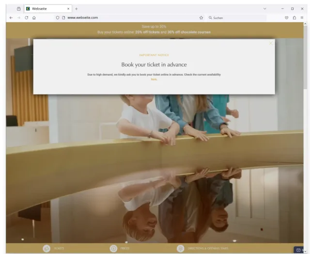 Die betrügerische Seite sieht auf den ersten Blick der offiziellen Website zum Verwechseln ähnlich. Grosse Bilder, funktionierende Unterseiten und ansprechendes Design vermitteln ein glaubwürdiges Bild. Das Angebot wird analog zur echten Seite präsentiert – inklusive Ticketkategorien und Kalenderansicht.