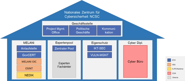 Im Zuge dieser Anstrengngen zur Erhöhung der Cybersicherheit von Bund und Wirtschaft, wird auch auf Basis bestehender Kompetenzen und Fachstellen wie der Melde- und Analysestelle Informationssicherung (Melani) das Nationale Zentrum für Cybersicherheit (National Cyber Security Centre - NCSC) aufgebaut.