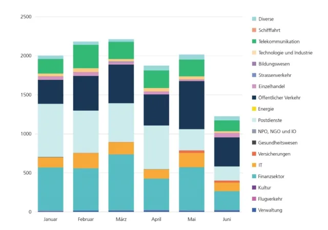 Übrigens: Auch das Bundesamt für Cybersicherheit (kurz BACS; Link zur Website ncsc.admin.ch) hat die Entwicklung in der Schweiz immer im Blick und veröffentlich frei zugängliche Halbjahresberichte. Der Bericht zum ersten Halbjahr 2024 zeigt, wie gross bereits der ständige Anteil an Phishing als Bedrohung ist, Bild 10. Im Vergleich zum Halbjahr 2023 hat sich die Zahl an Phishing-Angriffen verdoppelt. Auch die Übersicht der am meisten für Phishing missbrauchten Marken- und Firmennamen nach Branchen ist im Bericht sehr interessant, Bild 11.