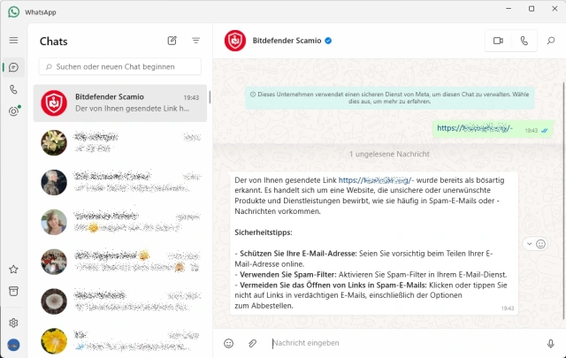 Anwendung Scamio von Bitdefender unter dem Link bitdefender.com/de-de/consumer/scamio. Es handelt sich um eine KI, der man am Smartphone Daten, Bilder und Links zum Sicherheitscheck geben kann – wenn man ein kostenloses Bitdefender-Konto hat, Bild 7.