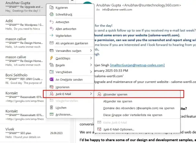 Outlook: In Outlook ist die Spam-Option etwas versteckt. Klicken Sie in der E-Mail-Übersicht eine nervige Mail mit der rechten Maustaste an und wählen Sie Junk-E-Mail. Danach können Sie gleich den Absender sperren, wenn die E-Mail schon öfter ankam, Bild 7.