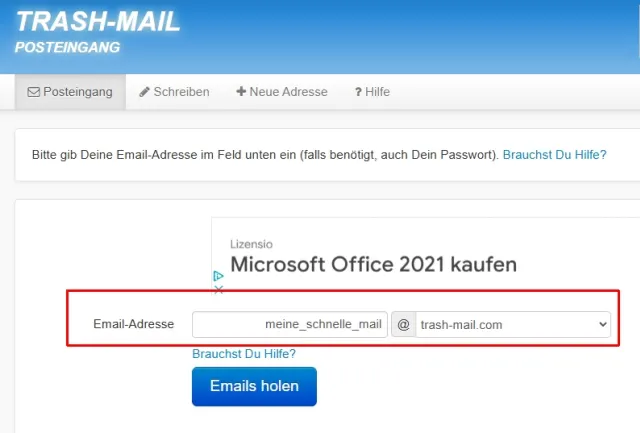Um schnell an eine Information zu kommen, für die allerdings eine E-Mail-Adresse verlangt wird, lassen sich Wegwerf-Adressen nutzen. Einer der bekanntesten Services ist Trash-Mail (trash-mail.com). Man muss sich bei dem Service nicht anmelden. Auf der Seite generiert man eine temporäre Adresse, zum Beispiel meine_schnelle_mail@trash-mail.com. Nun gibt man diese Adresse an, Bild 10. Die Antwortmail lässt sich auf der Webseite von Trash-Mail aufrufen und so etwa ein Bestätigungslink anklicken. Allerdings: Viele Anbieter kennen die Domains der Wegwerf-Adressen und reagieren nicht mehr darauf.