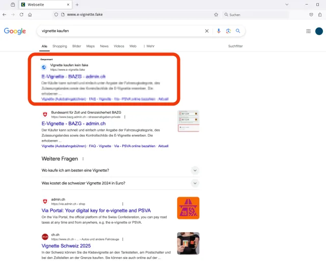Anlässlich der Online-Suche nach dem Begriff «Autobahnvignette» kann es vorkommen, dass bei Google oder einer anderen Suchmaschine an erster Stelle keine regulären Suchergebnisse, sondern Werbung (Google Ads) angezeigt wird. Diese Anzeigen können von inoffiziellen und deutlich teureren Anbietern stammen. Im schlimmsten Fall handelt es sich um Werbung von Betrügern, die gefälschte Websites betreiben und versuchen, die Kreditkartendaten potenzieller Opfer zu phishen.