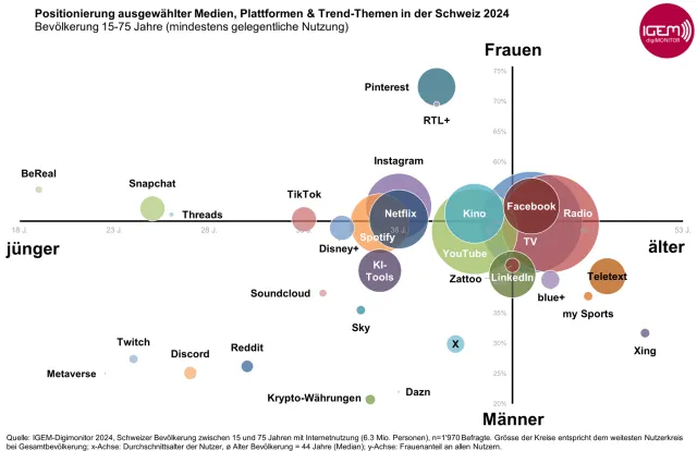 Instagram ist weiterhin mit 3,8 Millionen Nutzerinnen und Nutzern in der Schweiz die Plattform Nummer 1. Facebook kommt laut der Studie auf 3,3 Millionen, gefolgt von Linkedin mit 2,7 Millionen und Pinterest mit 2,2 Millionen. Snapchat und Tiktok, die bei Jüngeren angesagt sind, verzeichnen je 1,5 Millionen Nutzerinnen und Nutzer.