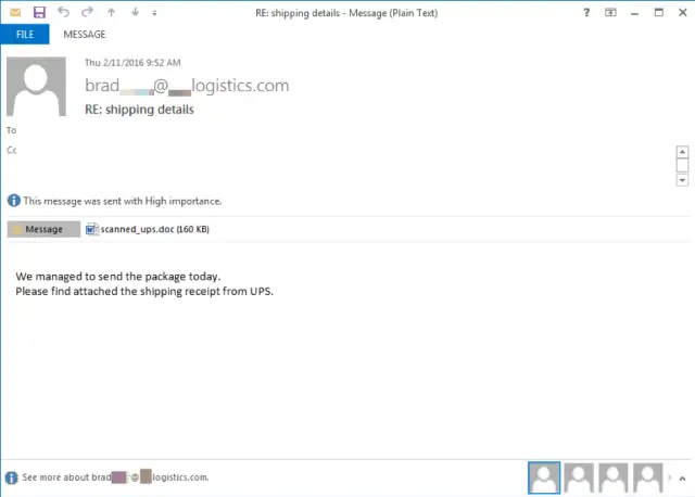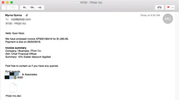 Diese E-Mail-Köder beinhalten häufig ein angehängtes Dokument mit einem eingebetteten, schädlichen Code, oftmals in Form eines bösartigen Makros, der vom Benutzer aktiviert werden muss. Durch das Ausführen des schädlichen Makros wird die Malware heruntergeladen und installiert. Beispiele sind ein Banking-Trojaner wie Dridex oder die jüngste Ransomeware wie Locky.