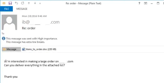 Die «Geschäftstransaktions»-E-Mail-Köder geben vor, sich auf ein mögliches Geschäft in der Zukunft zu beziehen, wie beispielsweise eine Preisauskunft, Import- und Exportarrangements, Preislisten und Verträge. Diese E-Mail-Köder weisen den Empfänger normalerweise an, einen Anhang zu öffnen, z. B. ein Dokument oder Arbeitsblatt, um die Einzelheiten einer Anfrage anzuzeigen. Der Angreifer hält dabei die Nachricht im Mail bewusst kurz und einfach, damit das Opfer das Dokument auf der Suche nach mehr Infos auch öffnet. Einmal offen wird der eingebettete, schädliche Code ausgeführt.