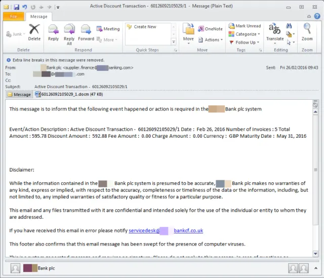 Social-Engineering-E-Mails in dieser Kategorie scheinen üblicherweise von einer Bank oder einem Finanzinstitut zu stammen und ködern den Benutzer mit Nachrichten über eine elektronische oder Online-Zahlung, die für den Empfänger bestimmt ist. Doch zuvor sollten die Kontoinformationen im angehängten Dokument bestätigt oder korrigiert werden, so der Trick der Angreifer, welche mittlerweile lieber präparierte Dateien verschicken als URL auf Malware-verseuchte Seiten. Auch hier führt das Öffnen des Files dazu, dass der eingebettete, bösartige Code ausgeführt. Mit Vorliebe gelangen so Bank-Trojaner oder Ransomware auf das Gerät.