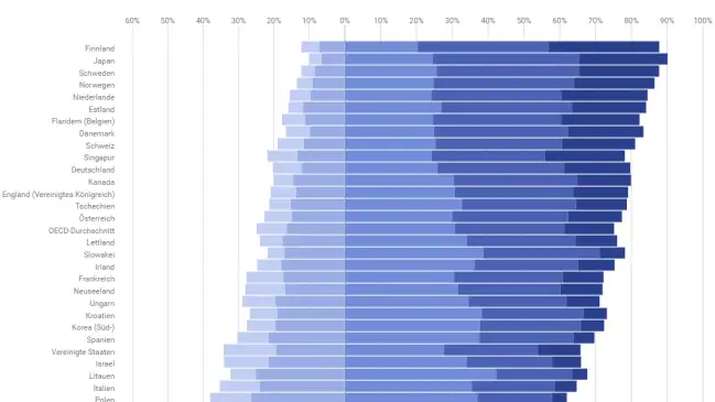 Im Lesen, in Alltagsmathematik und im Problemlösen weisen die Erwachsenen in der Schweiz im internationalen Vergleich überdurchschnittliche Werte aus. Trotzdem haben ungefähr 30% der 16- bis 65-Jährigen in mindestens einem dieser drei Bereiche geringe Kompetenzen.