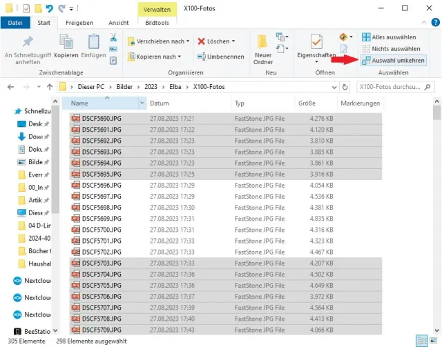 Müssen Sie sehr viele Dateien mit dem Windows-Explorer markieren, wollen dazu aber nicht mühsam Dutzende oder gar Hunderte Einträge anklicken? Dann kehren Sie den Prozess einfach um: Markieren Sie zuerst alle Dateien, die Sie nicht auswählen wollen, und klicken Sie danach auf dem Reiter Start ganz rechts auf die Schaltfläche Auswahl umkehren, Bild 1. Windows-11-Nutzer klicken zuerst auf die Schaltfläche mit den drei Punkten und finden dort die Option Auswahl umkehren.